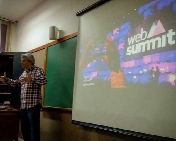 Ele compartilhou com os alunos informações sobre o evento Web Summit, no qual participou em Lisboa em novembro de 2016.